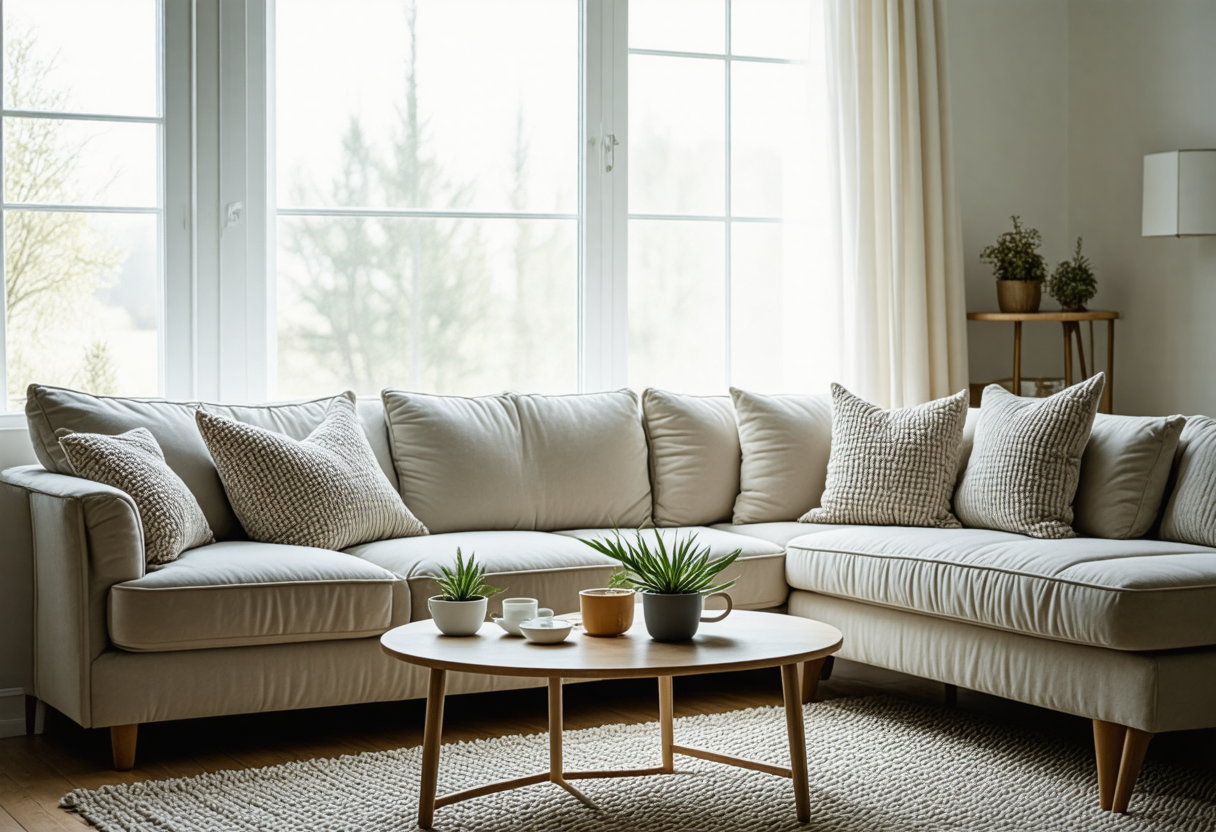 Una sala de estar nórdica combina un sofá en tonos neutros con una mesa de centro de madera clara. Añade luminarias de pie, alfombras suaves y plantas de interior para completar.